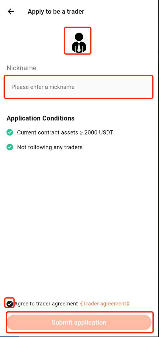 Edit your nickname and avatar, read the Trader Agreement, and then click Submit Application
