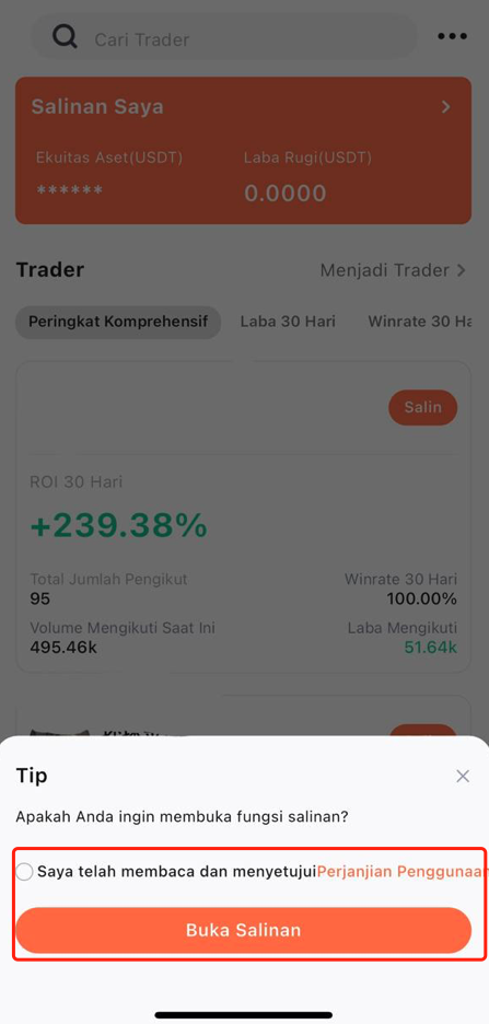 2. Baca dan setujui "Perjanjian Pengguna Copy Trader" lalu klik Aktifkan Copy Trade.