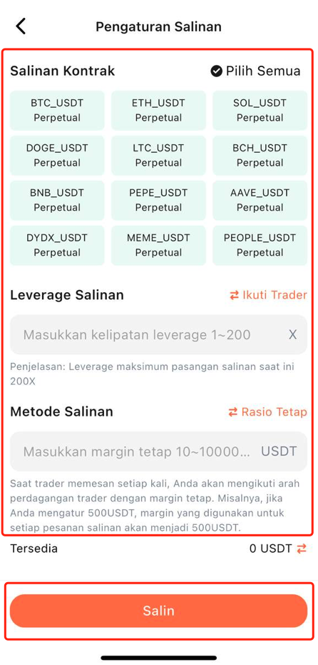 4. Pilih pasangan mata uang kripto kontrak yang ingin Anda ikuti, atur leverage copy trading Anda, metode copy trading, dan rasio take profit/stop loss untuk kontrol risiko. Setelah pengaturan selesai, klik Copy Trade untuk mengikuti trader tersebut.