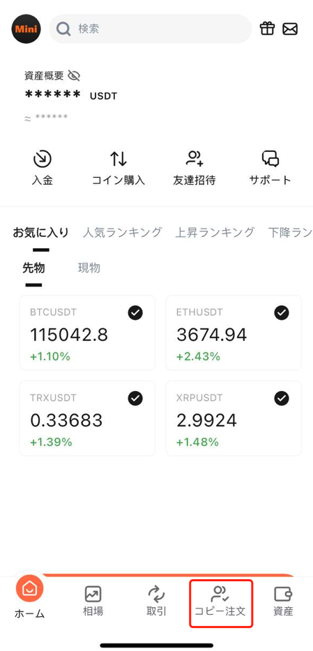 1. アプリを開き、トップページで「コピー取引」をタップします。