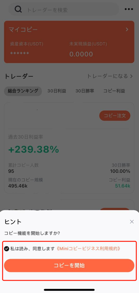 2. 「コピー取引利用規約」をよく読んで同意した後、「コピー取引開始」をタップします。