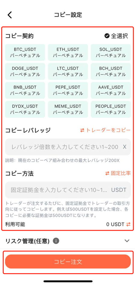 4. コピー取引したい契約取引の通貨ペアを選択し、レバレッジ倍数、コピー取引の方法、リスク管理のための利益確定と損失確定の比率を設定します。設定が完了したら「コピー取引開始」をタップすれば、トレーダーをフォローできます。