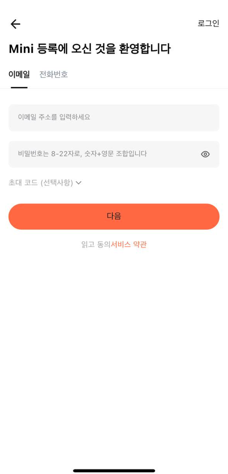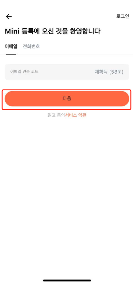 이메일 또는 휴대폰 번호를 선택하고 관련 정보를 입력한 후 '다음'을 누릅니다.