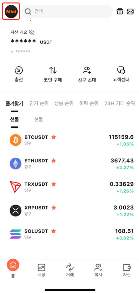 앱 홈 페이지를 열고 왼쪽 상단의 메뉴를 클릭합니다.
