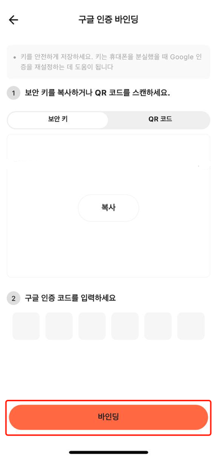 4. Google Authenticator를 다운로드하세요. 다른 인증 앱이 이미 있거나 다운로드 완료 후, 해당 인증 앱으로 상단의 QR 코드를 스캔하거나 키를 복사하여 인증 앱에 추가하세요. 이후 인증 앱에 표시되는 6자리 인증 코드를 입력하고 하단의 [바인딩]을 클릭하면 2단계 인증 설정이 완료됩니다.