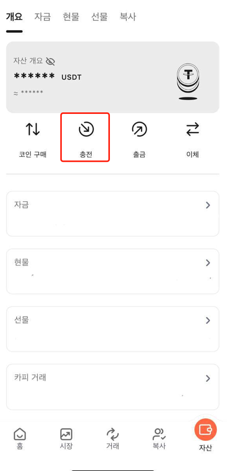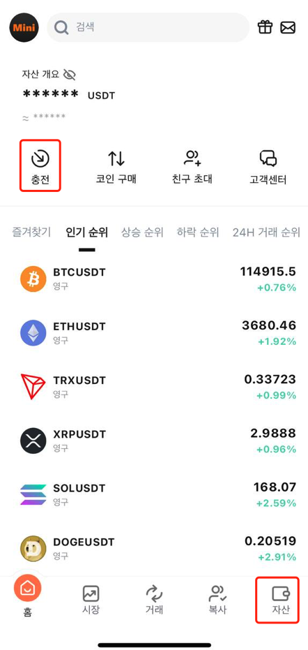 1. 앱 메인 화면으로 이동하여 "입금" 또는 "자산"을 클릭합니다.
