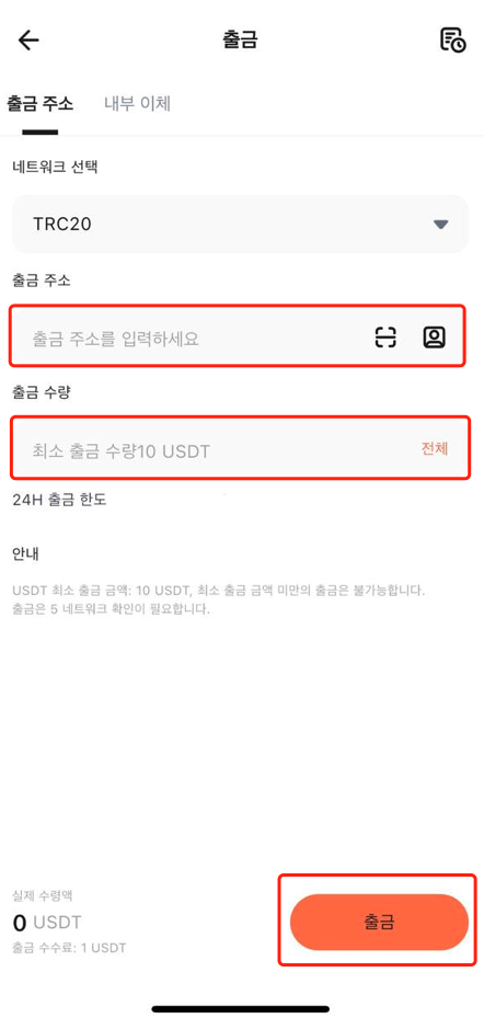 3. 해당 출금 주소와 금액을 입력하고 "출금"을 클릭합니다.