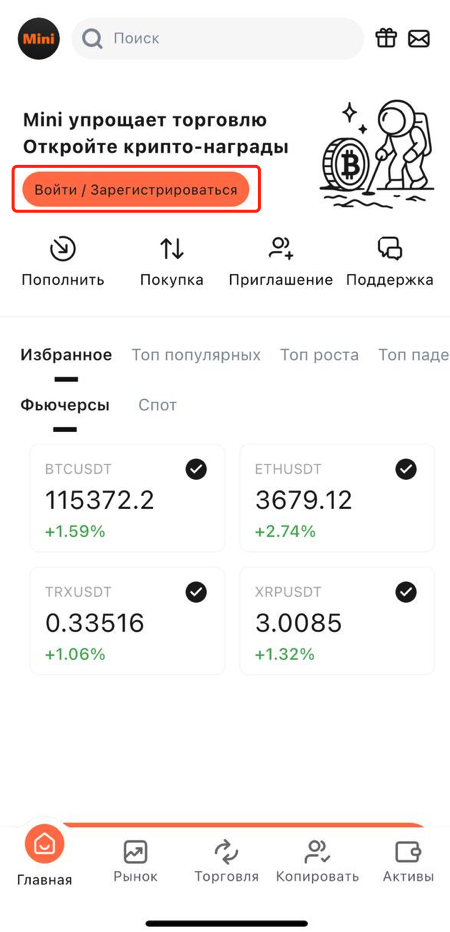 На главной странице приложения нажмите на Вход/Регистрация.