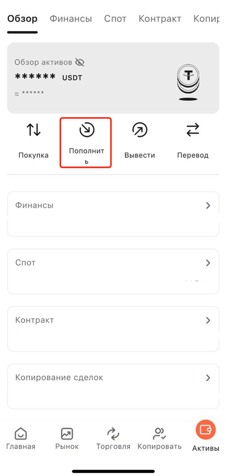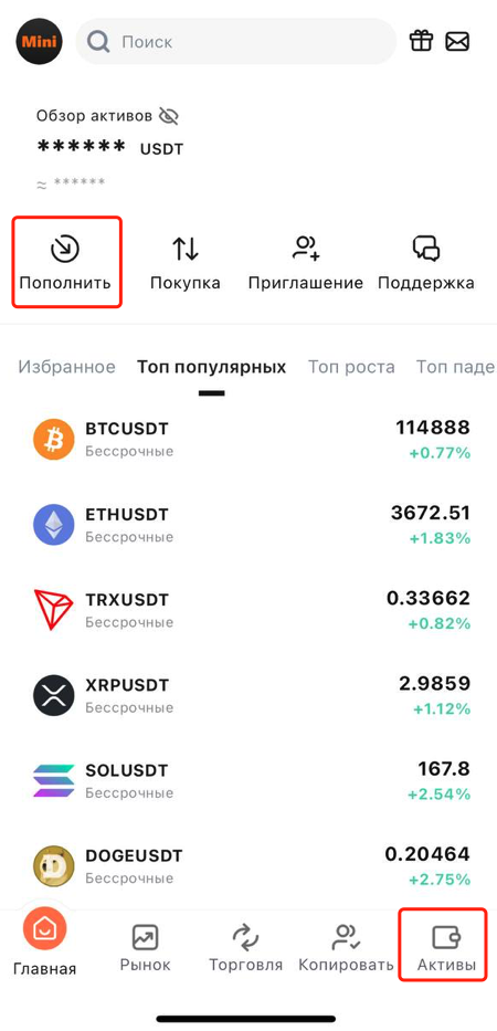 1. Откройте главную страницу приложения и нажмите "Пополнить баланс" или "Активы".