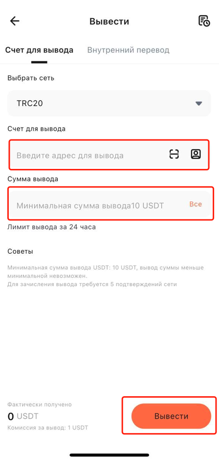 3. Заполните поле с адресом для вывода средств и укажите сумму, затем нажмите "Вывести".