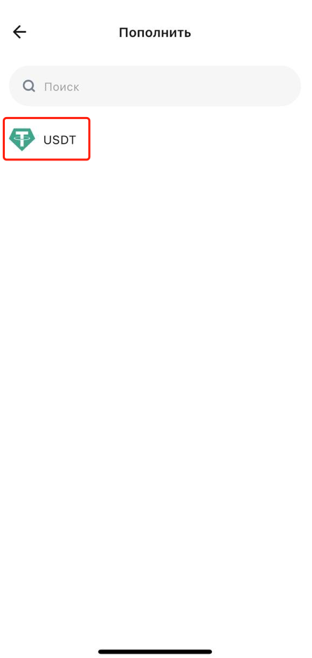 3. Выберите криптовалюту (например, USDT) и соответствующую блокчейн-сеть для пополнения.
