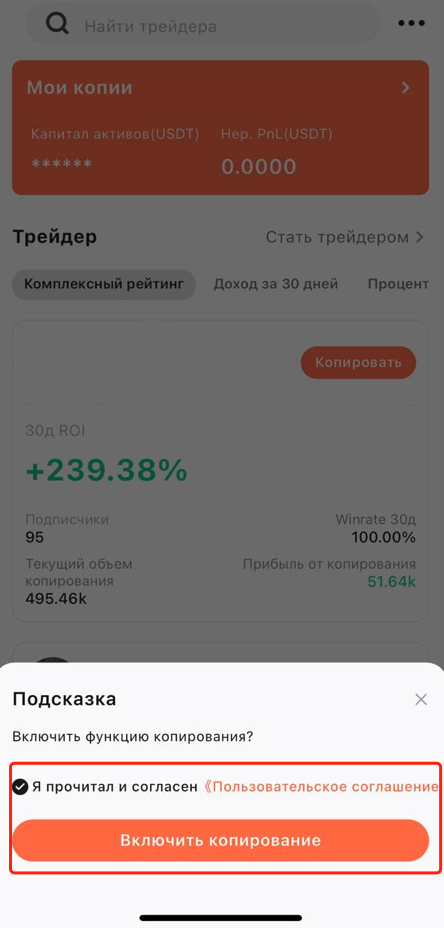 2. Прочитайте и согласитесь с «Пользовательским соглашением для копирования сделок», затем нажмите «Открыть копирование сделок».