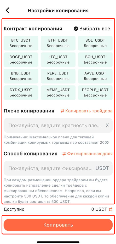 4. Выберите криптовалюту для контрактной торговли, которую вы хотите копировать, установите желаемое плечо для копирования сделок, способ копирования и уровни тейк-профита и стоп-лосса для управления рисками. После завершения настройки нажмите «Копировать сделки», чтобы начать следовать за трейдером.