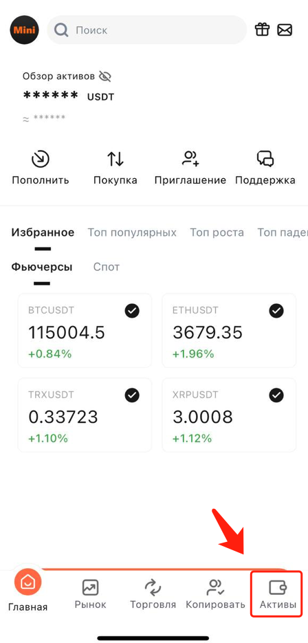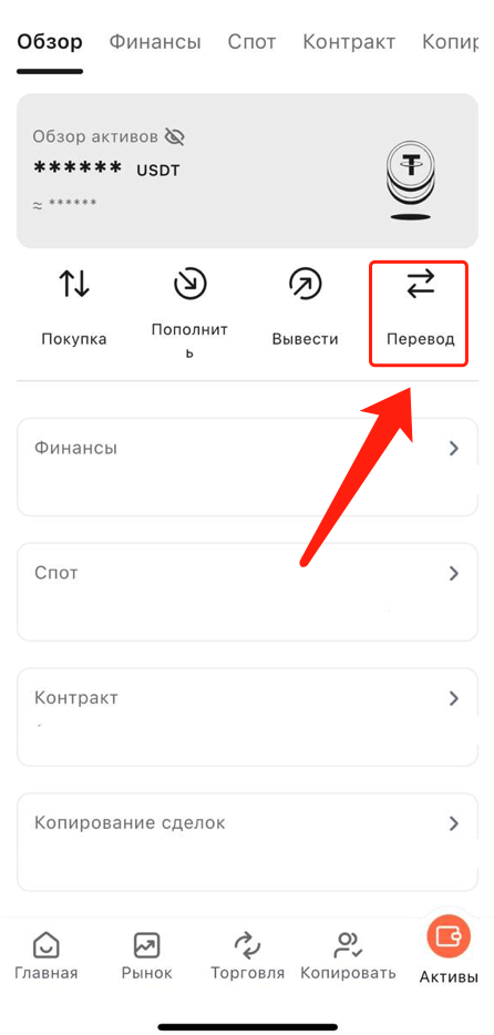 1. Зайдите на главную страницу, нажмите «Активы», затем нажмите «Перевод».