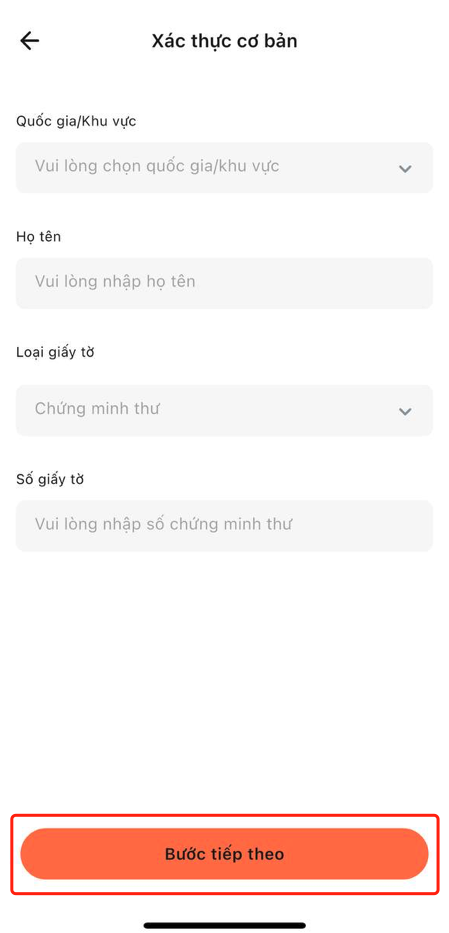 Chọn quốc gia/khu vực và loại giấy tờ, nhập tên và số giấy tờ, sau đó nhấp vào "Tiếp theo".