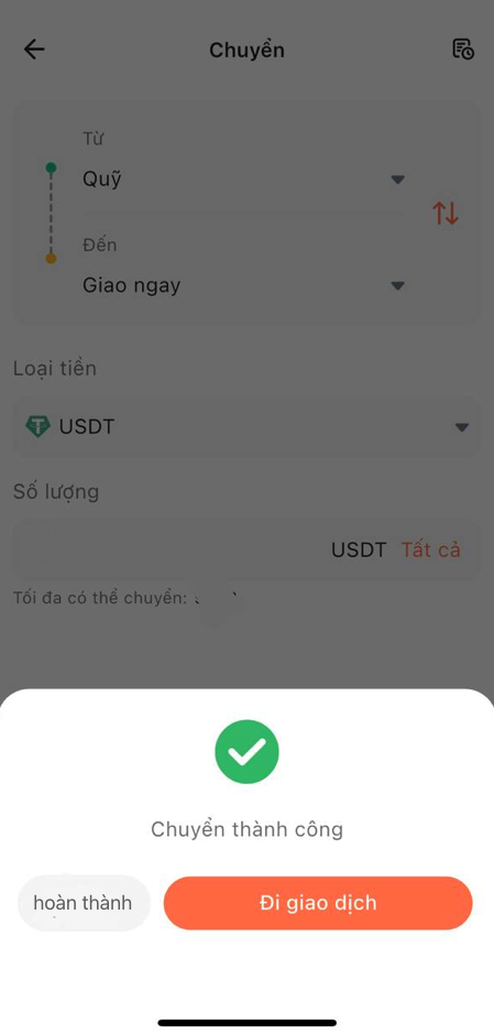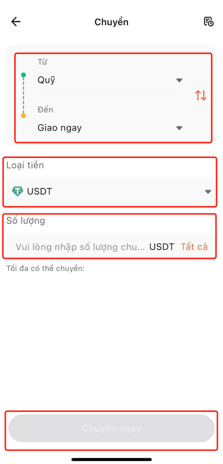 2. Chọn loại tài khoản cần chuyển tiền (tài khoản hợp đồng, tài khoản giao ngay, tài khoản tiền gửi, tài khoản theo dõi giao dịch), nhập số tiền cần chuyển, xác nhận lại thông tin chính xác rồi nhấp vào "Chuyển khoản ngay" để hoàn tất thao tác.
