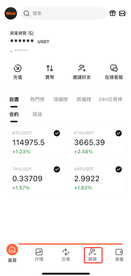 1.打开app,进入首页点击跟单