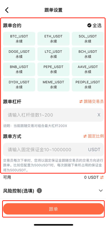 4.选择您想跟随的合约交易币种,设置您的跟单杠杆倍数和跟单方式以及风险控制的止盈止损比例,设置完成点击跟单即可跟随交易员。