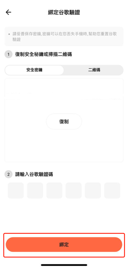 下載Google Authenticator。若您已有其他身分驗證器或已完成下載,請使用驗證器掃描上方的QR碼進行新增,或複製密鑰至身分驗證器手動新增。接著輸入驗證器顯示的6位數驗證碼,點擊下方【綁定】按鈕,即可完成雙重驗證設定